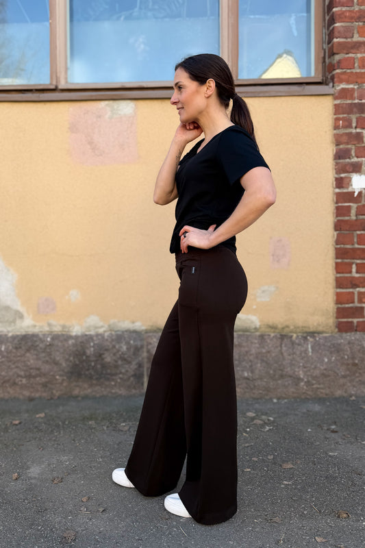 Aava-housuja löytyy kahdessa lahjepituudessa ja useassa värissä. Uutuutena ihana tummanruskea sävy täyspitkiin Aava-housuihin!