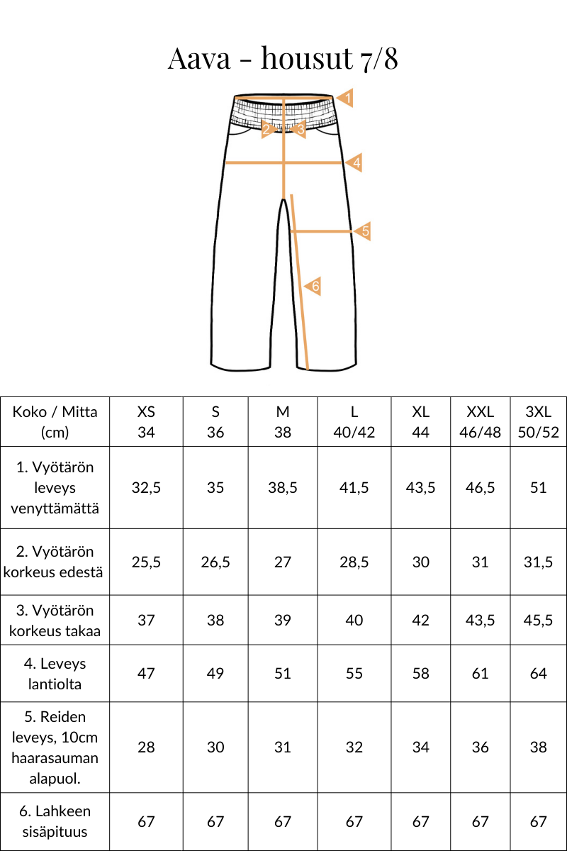 Aava-housut ovat erittäin mukavat päällä ja sopivat monenlaiseen käyttöön. Aava-housuissa on leveä rypytetty kuminauhavyötärö ja edessä taskut. Pystymallinen tasku sopii hyvin myös lanteikkaalle eikä aukea käytössä. Vyötärö on korkeahko ja leveä rypytetty kuminauhavyötärö on mukava ja ryhdikäs. Lahkeenmitta on pituudeltaan 7/8 eli nilkkapituinen ja lahkeen malli leveä. Materiaalina on joustava ja pehmeä viskoosipohjainen neulos. Väri on tumma beige, joka taittaa hieman savenruskeaan. Aava-housuja on saatavilla myös mustana. Mittataulukot löydät tuotekuvista.