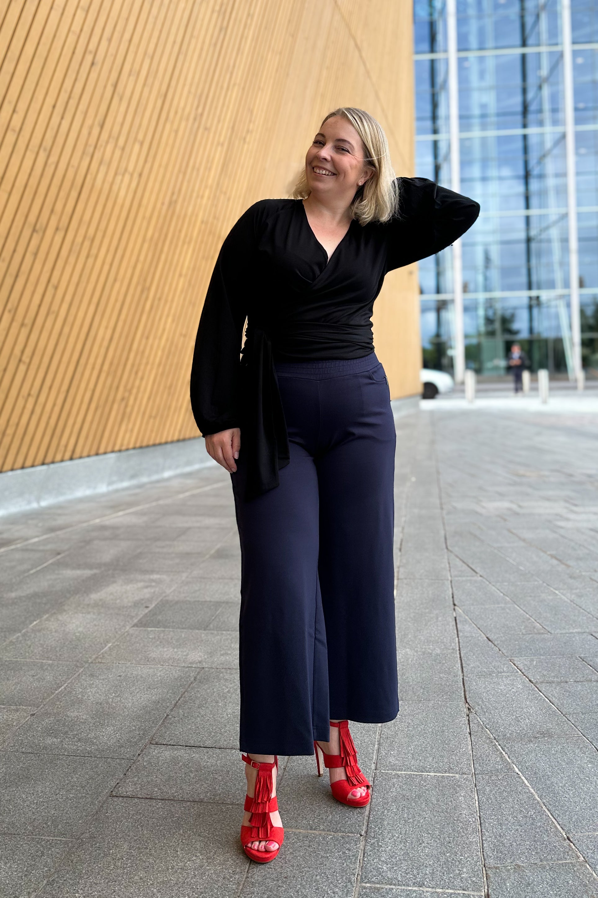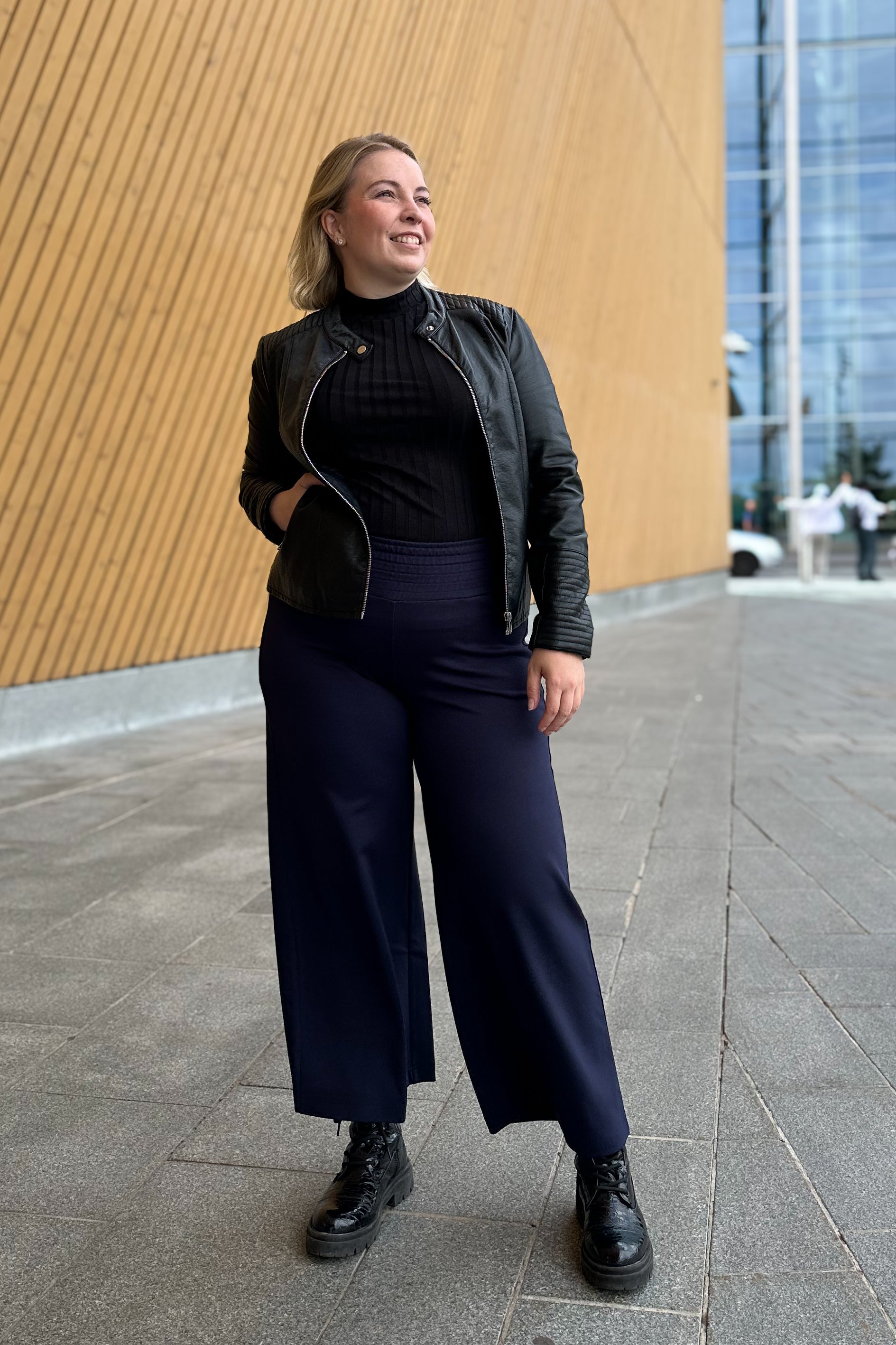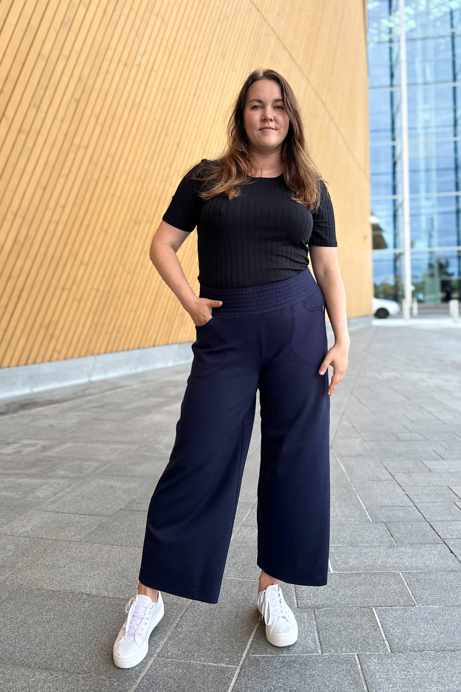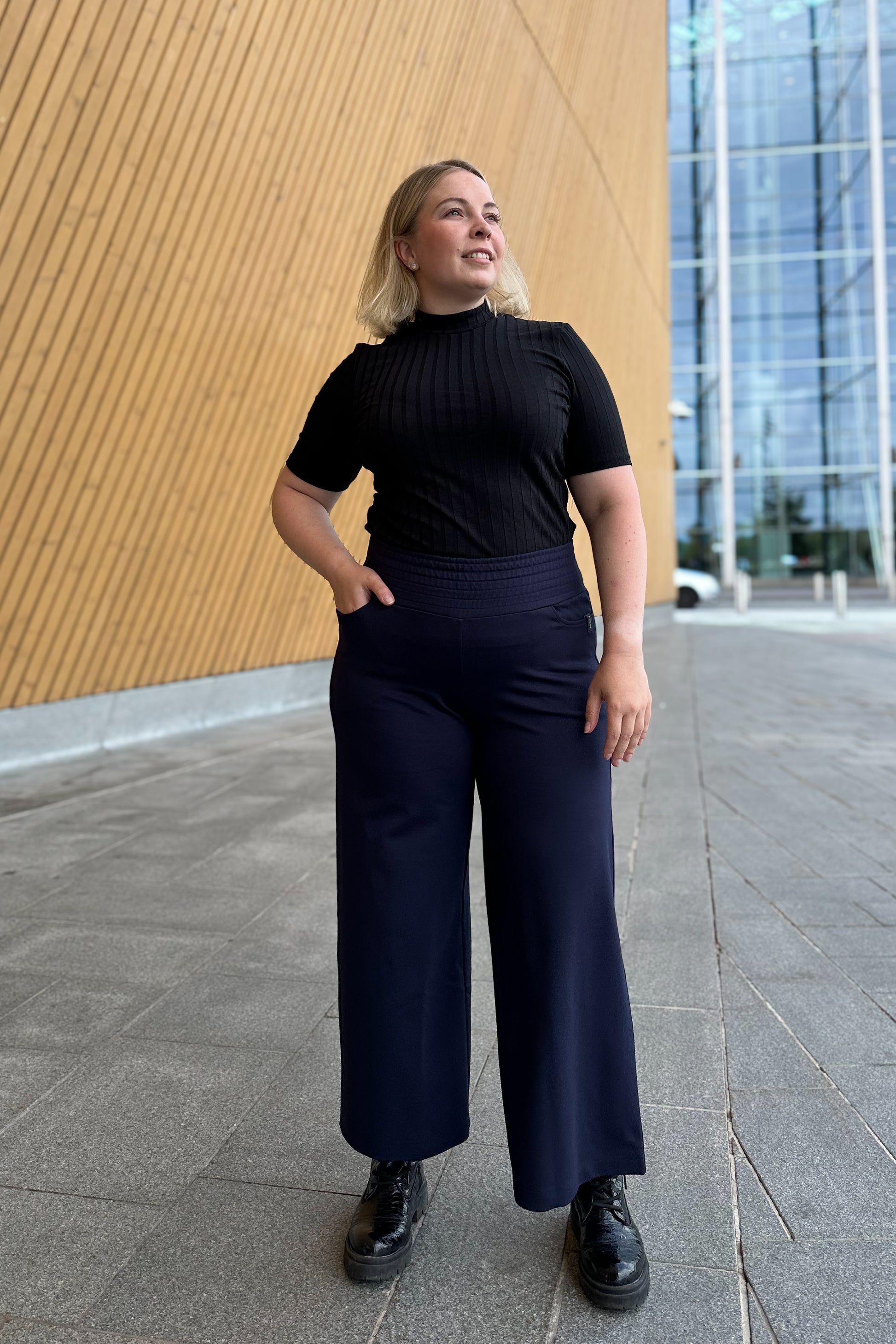 Supersuosittujen Aava-housujen uutuusväri! Aava-housut ovat erittäin mukavat päällä ja sopivat monenlaiseen käyttöön. Aava-housuissa on leveä rypytetty kuminauhavyötärö ja edessä taskut. Pystymallinen tasku sopii hyvin myös lanteikkaalle eikä aukea käytössä. Vyötärö on korkeahko ja leveä rypytetty kuminauhavyötärö on mukava ja ryhdikäs. Lahkeenmitta on pituudeltaan 7/8 eli nilkkapituinen ja lahkeen malli leveä. Materiaalina on joustava ja pehmeä viskoosipohjainen neulos. Väri on kaunis tummansininen. Aava-housuja on saatavilla 7/8 pituudessa myös mustana ja ruskeana ja täyspitkällä lahkeella mustana. Mittataulukot löydät tuotekuvista.