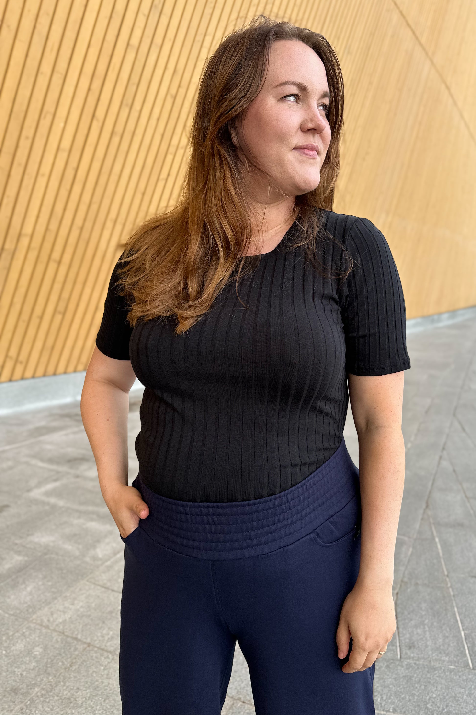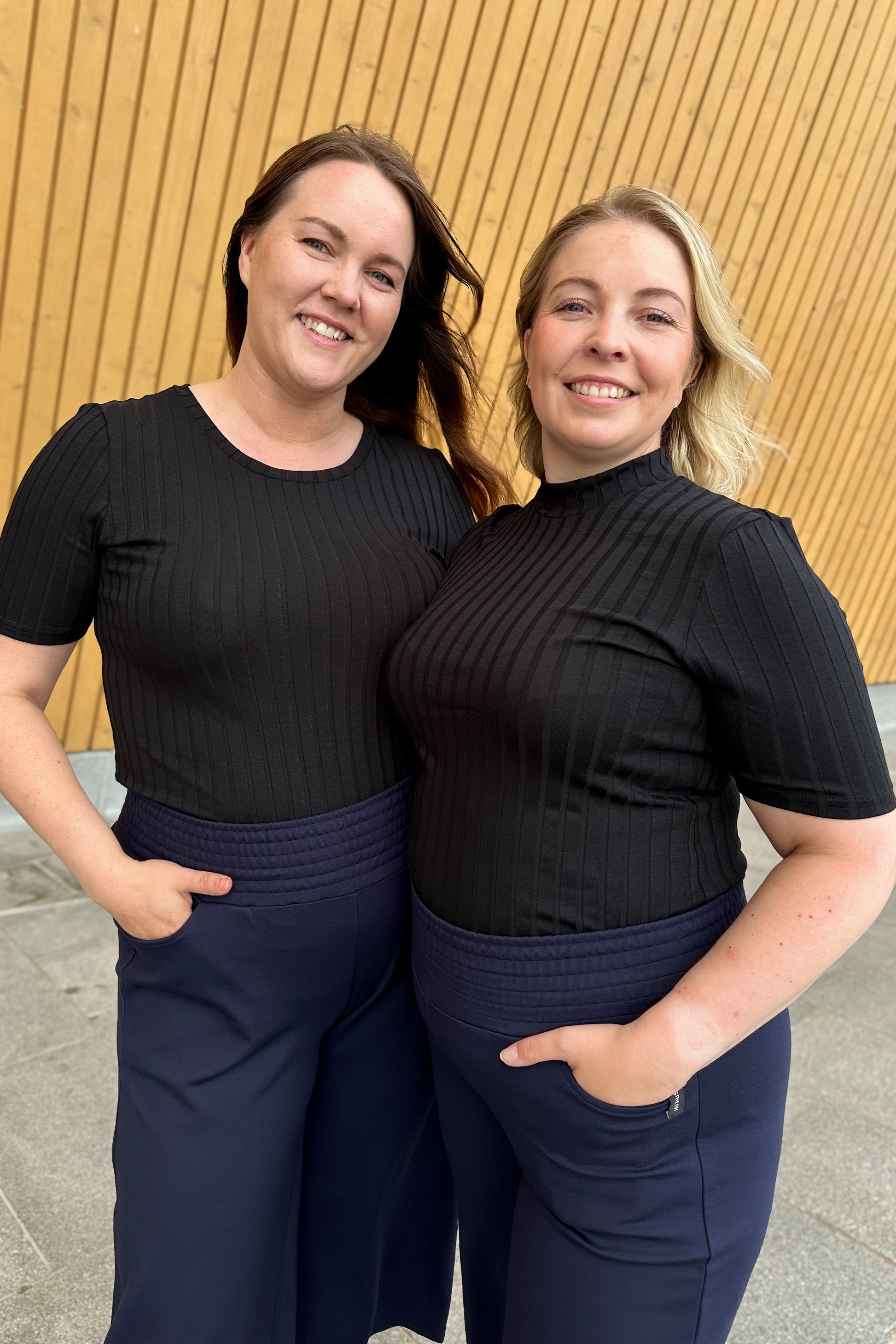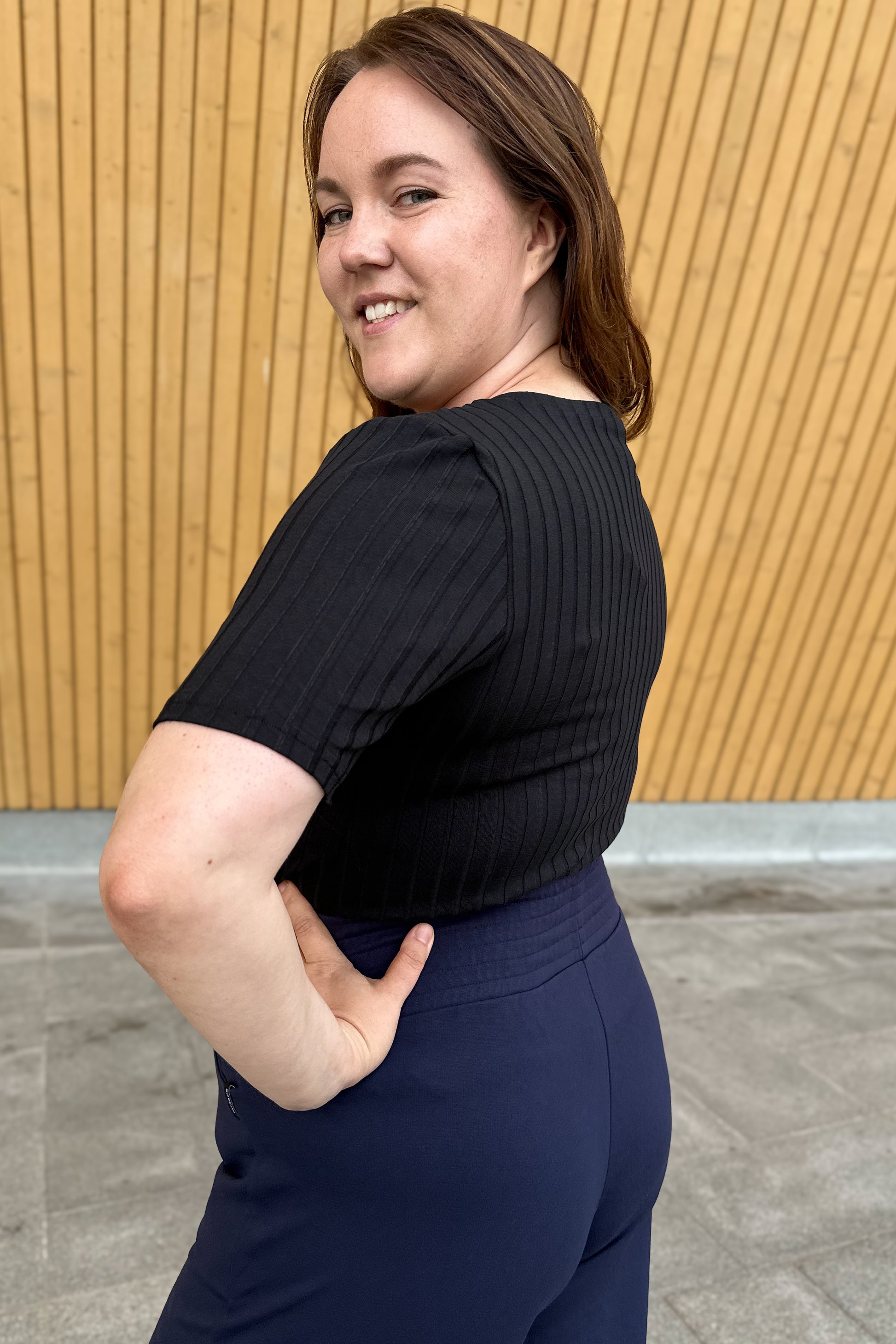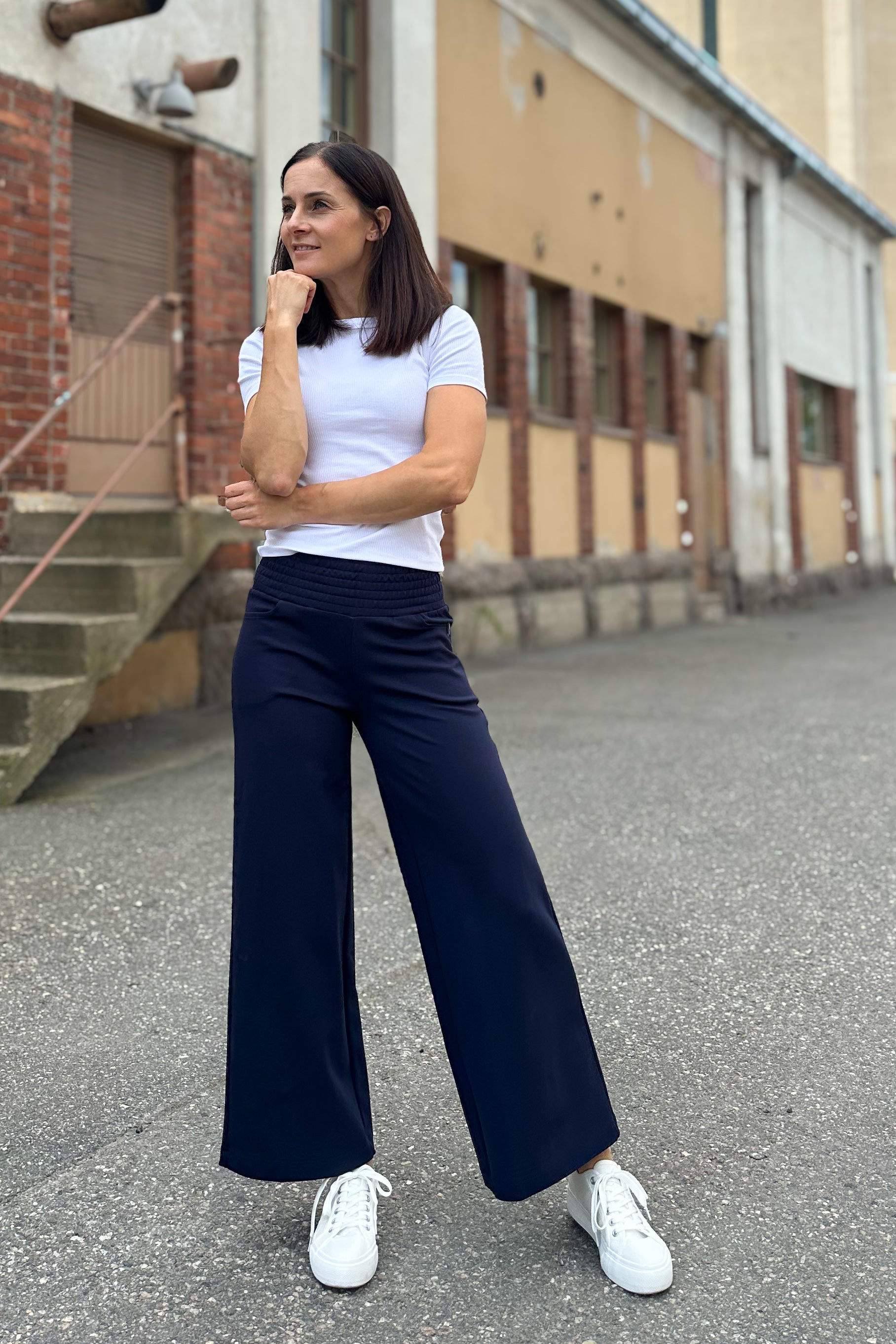 Supersuosittujen Aava-housujen uutuusväri! Aava-housut ovat erittäin mukavat päällä ja sopivat monenlaiseen käyttöön. Aava-housuissa on leveä rypytetty kuminauhavyötärö ja edessä taskut. Pystymallinen tasku sopii hyvin myös lanteikkaalle eikä aukea käytössä. Vyötärö on korkeahko ja leveä rypytetty kuminauhavyötärö on mukava ja ryhdikäs. Lahkeenmitta on pituudeltaan 7/8 eli nilkkapituinen ja lahkeen malli leveä. Materiaalina on joustava ja pehmeä viskoosipohjainen neulos. Väri on kaunis tummansininen. Aava-housuja on saatavilla 7/8 pituudessa myös mustana ja ruskeana ja täyspitkällä lahkeella mustana. Mittataulukot löydät tuotekuvista.