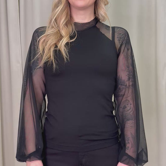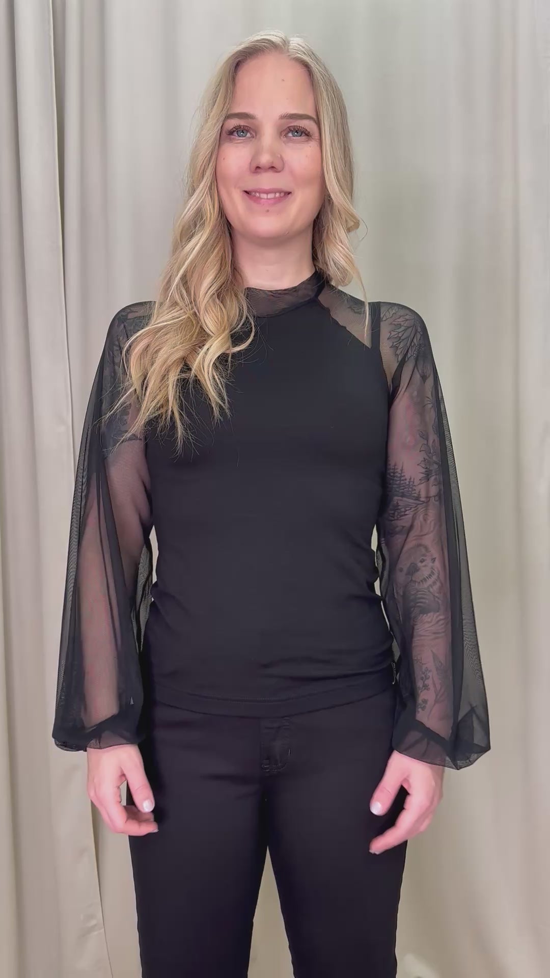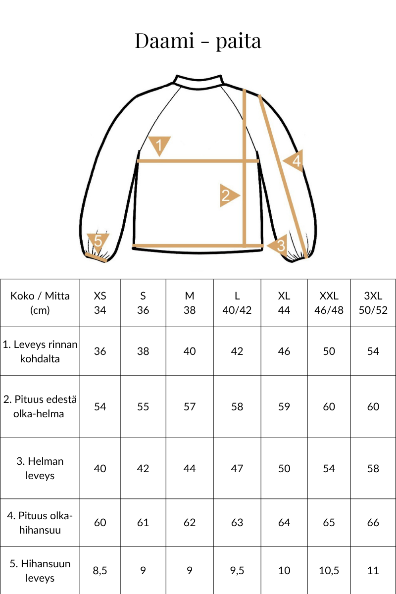Daami-paita on upea yhdistelmä läpinäkyvää joustavaa mesh-kangasta ja silkinpehmeää lyocelltrikoota. Daami-paita on malliltaan istuva ja runsaat hihat tekevät paidasta näyttävän. Trikoinen etu- ja takakappale yhdistettynä läpinäkyviin mesh-hihoihin tekevät kokonaisuudesta tyylikkään ja varman valinnan vaikkapa pikkujouluihin tai illanviettoon. Daami-paidassa on mesh-kankainen kilpikonnapääntie. Mittataulukot löydät tuotekuvista.
