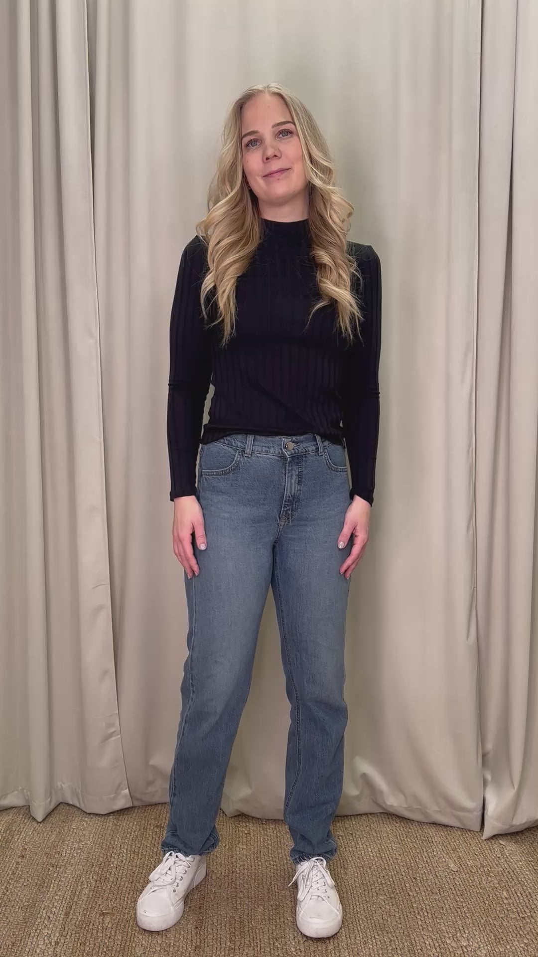 - Kiharahiuksisen mallin mitat, farkut koko L: pituus 164cm, ry 103cm, vy 79cm, ly 113cm.
