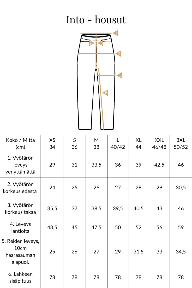 Into-housut ovat mukavat ja monenlaiseen tyyliin sopivat housut töihin ja vapaa-ajalle. Into-housuissa on normaalikorkuinen joustava kuminauhavyötärö, joka on mukava vatsalle. Housuissa on pystytaskut edessä, joten ne eivät aukea käytössä lanteikkaallakaan. Into-housuissa on kapea täyspitkä lahje, jonka voi helposti kääntää myös vajaamittaiseksi. Materiaalina on paksuhko ja napakka viskoosipuntoneulos. Mittataulukot löydät tuotekuvista.