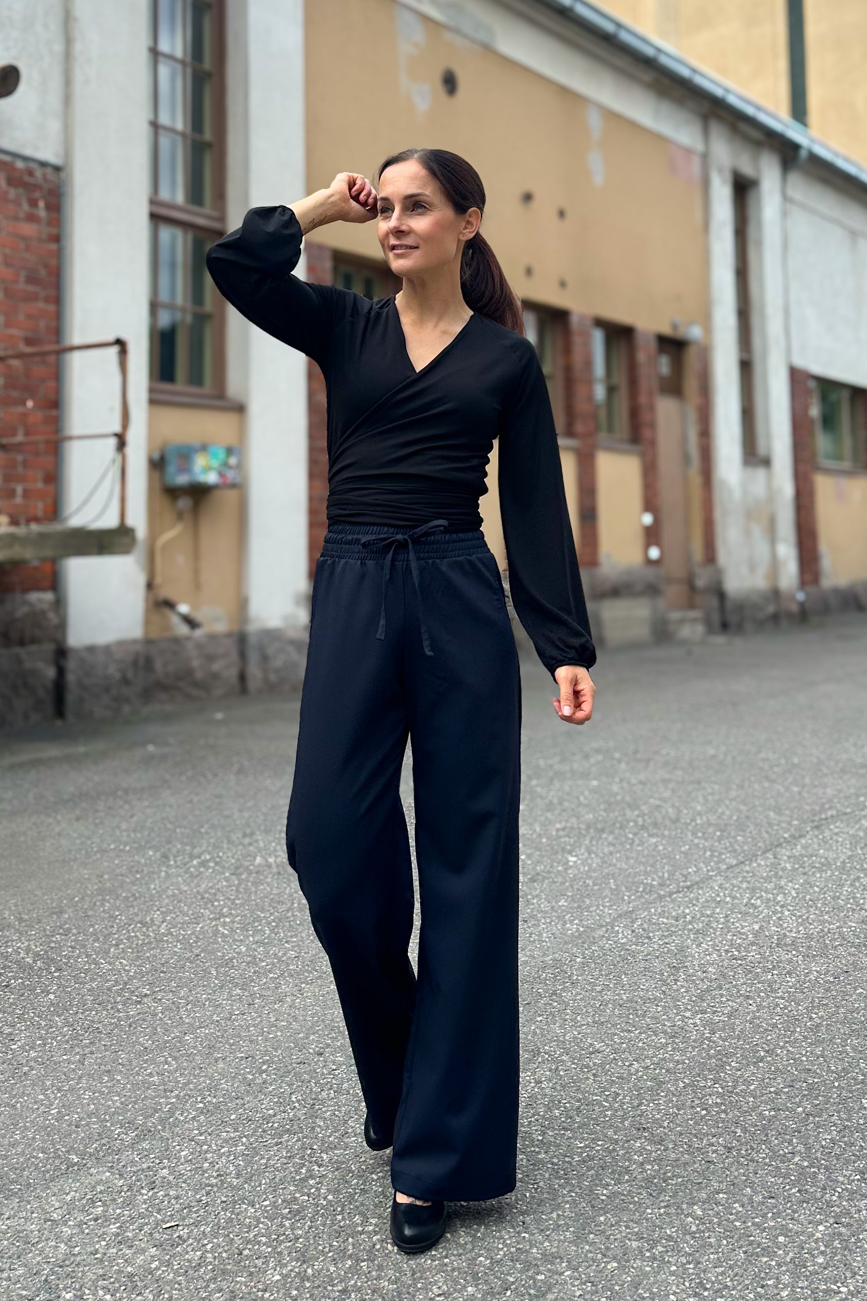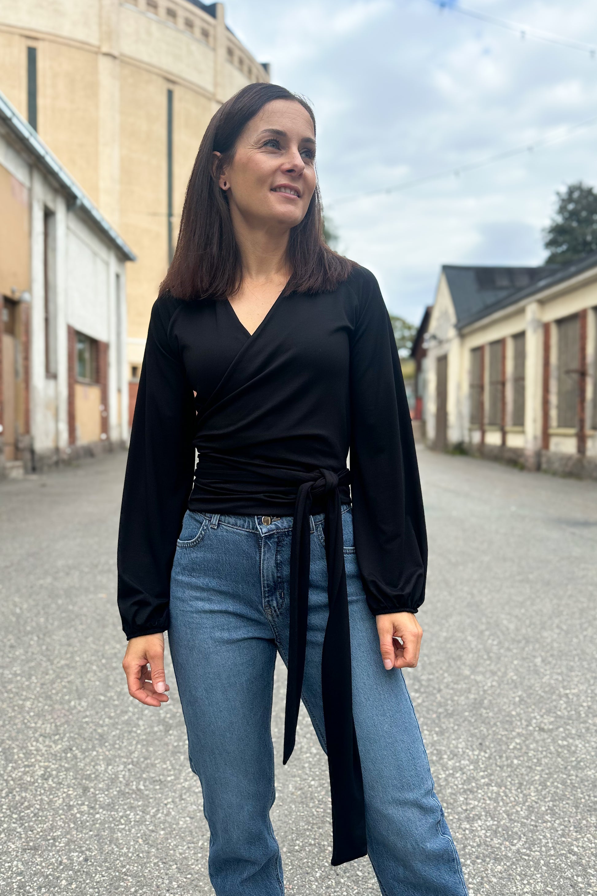 Kauno-kietaisupaita on kaunis ja tuntuu päällä todella pehmeältä. Paidassa on kauniisti pussittavat raglanhihat, kaksinkertainen etuosa ja pitkät leveät nauhat. Voit solmia nauhat eteen, sivulle tai taakse, joten paidan ilmettä on helppo muokata. Myös pääntien avonaisuutta voit vaihdella fiiliksen mukaan asettelemalla etuosat enemmän tai vähemmän päällekkäin. Kauno-kietaisupaita on valmistettu ihanan pehmeästä lyocell-trikoosta, joka tuntuu päällä kuin toiselta iholta eikä hiosta. Mittataulukot löydät tuotekuvista.