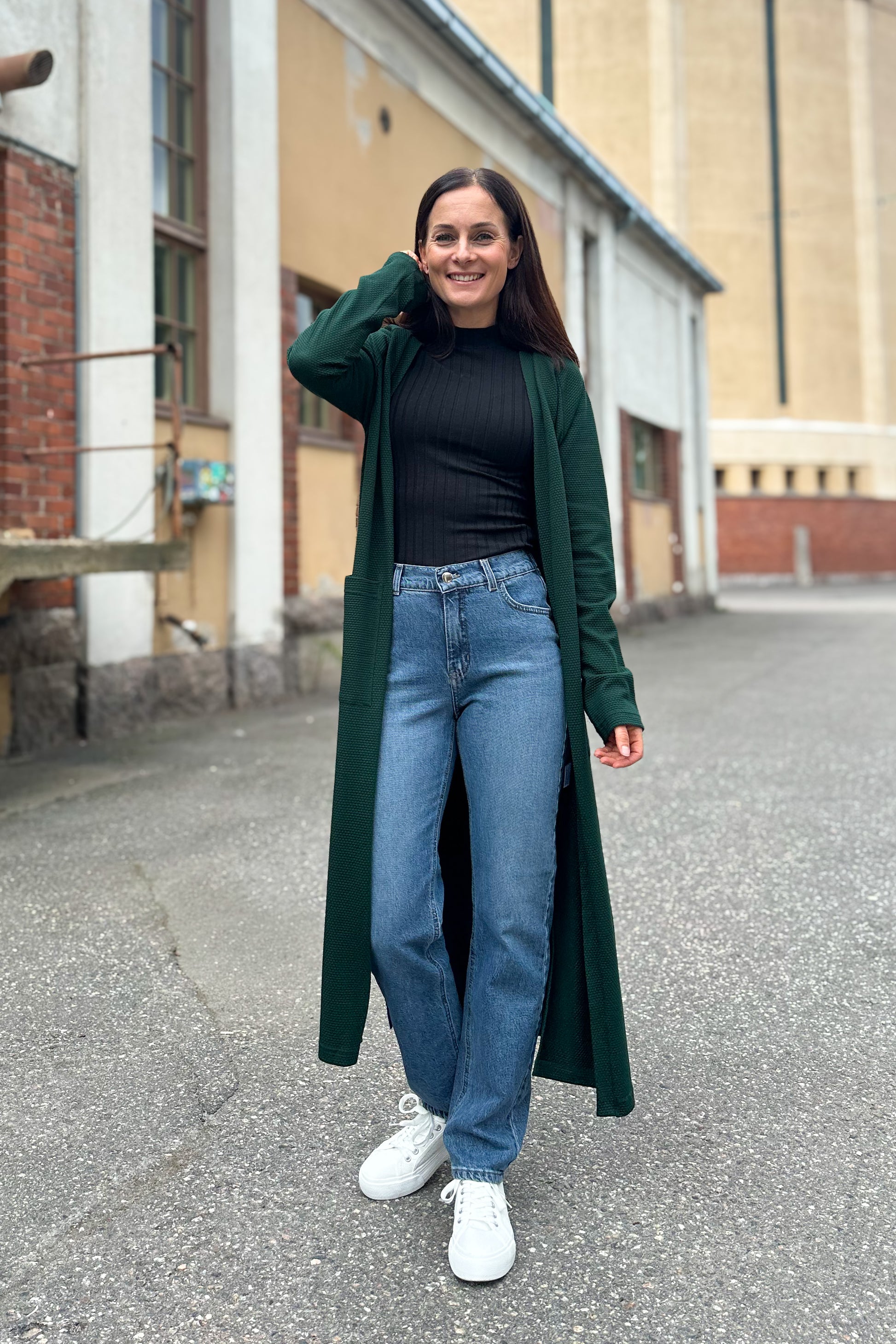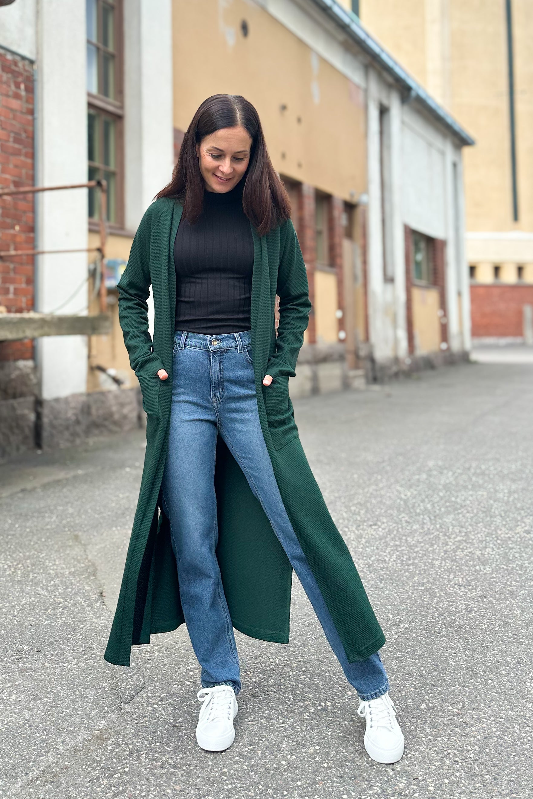 Luotto-puuvillatakki on rennon tyylikäs, mukava ja helppo lisätä mukaan asuun kuin asuun. Käytä takkia neuletakin tapaan, se toimii niin housujen kuin hameiden ja mekkojen kanssa. Halkiot sivuissa ja reilunkokoiset käytännölliset päällitaskut ovat kiva yksityiskohta. Materiaalina on 100% puuvillainen ohuehko kohoneulos, materiaalin tekstuuri tuo takkiin ilmettä! Värinä on helposti yhdisteltävä havunvihreä. Mittataulukot löydät tuotekuvista.