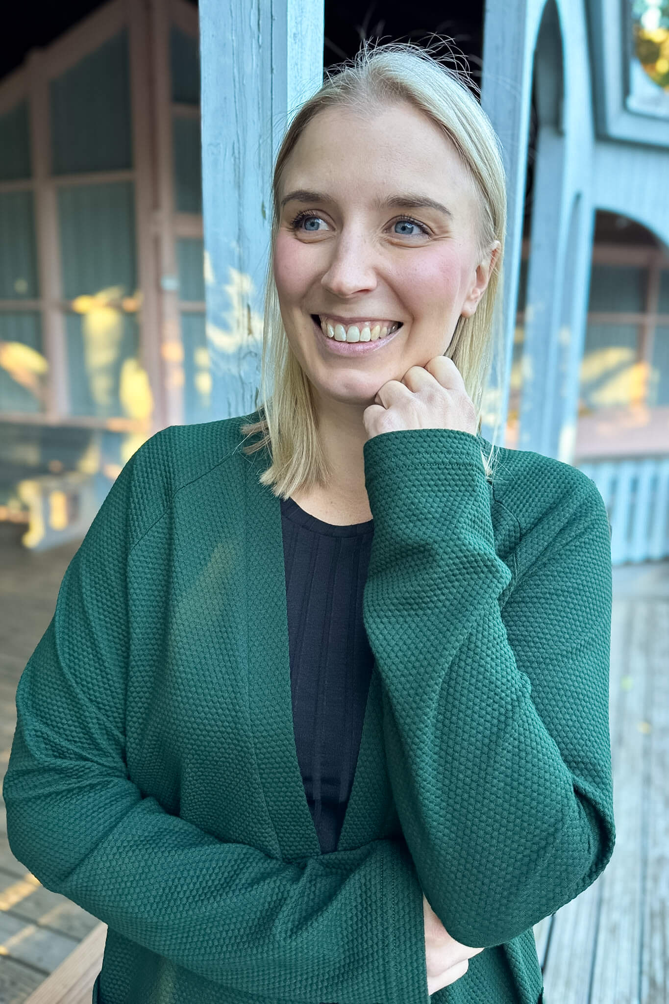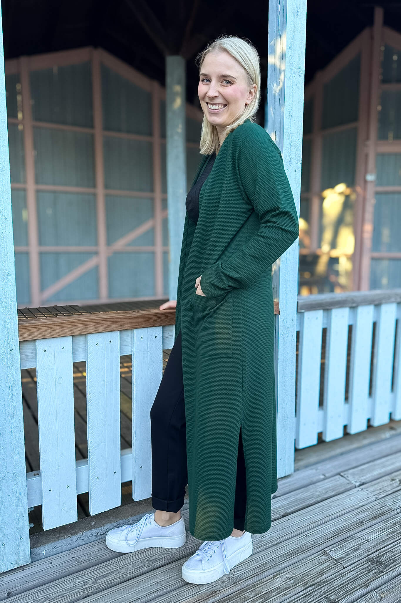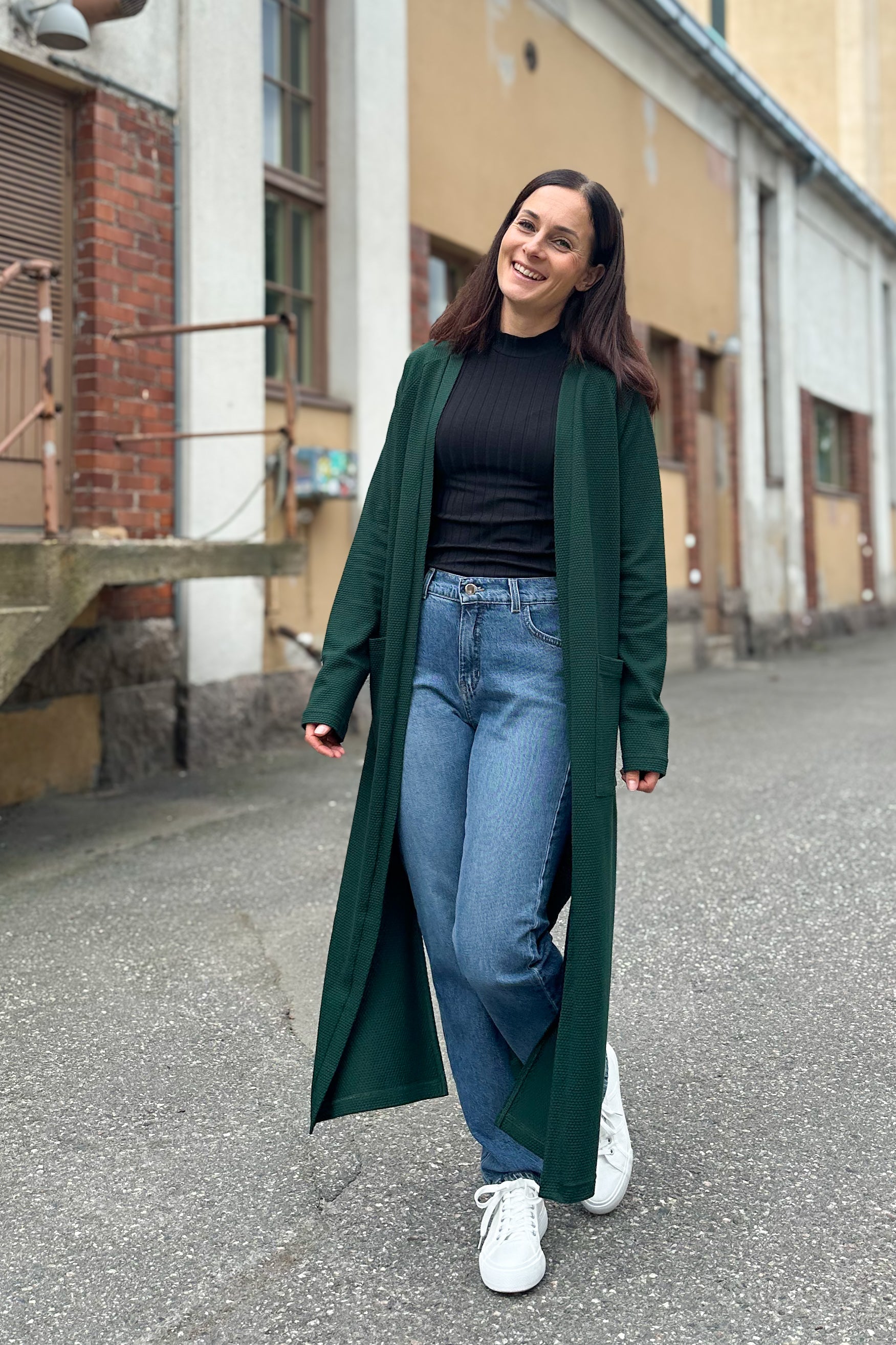 Luotto-puuvillatakki on rennon tyylikäs, mukava ja helppo lisätä mukaan asuun kuin asuun. Käytä takkia neuletakin tapaan, se toimii niin housujen kuin hameiden ja mekkojen kanssa. Halkiot sivuissa ja reilunkokoiset käytännölliset päällitaskut ovat kiva yksityiskohta. Materiaalina on 100% puuvillainen ohuehko kohoneulos, materiaalin tekstuuri tuo takkiin ilmettä! Värinä on helposti yhdisteltävä havunvihreä. Mittataulukot löydät tuotekuvista.