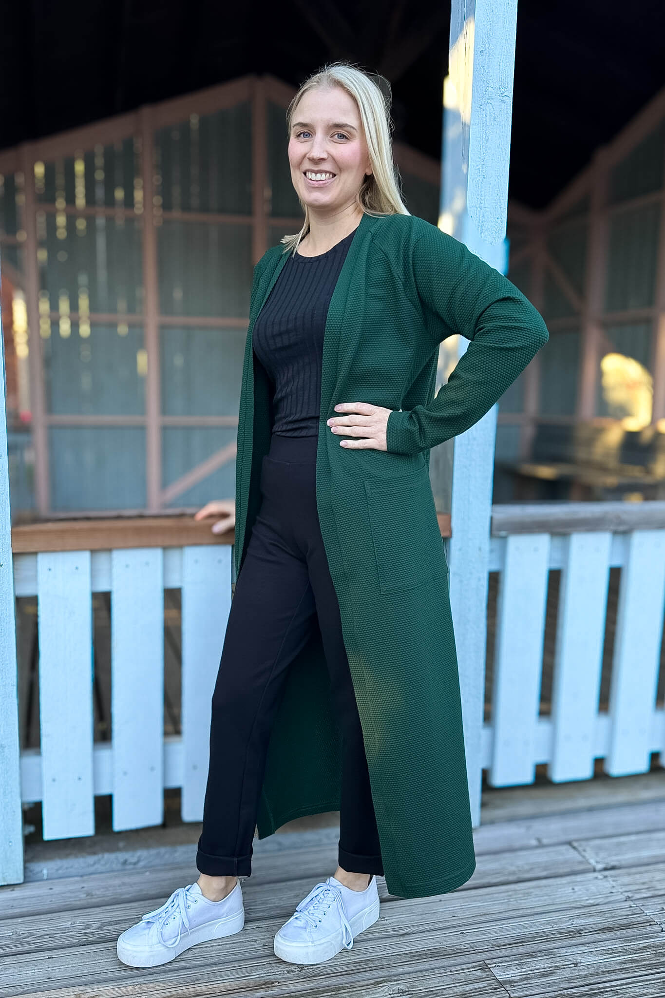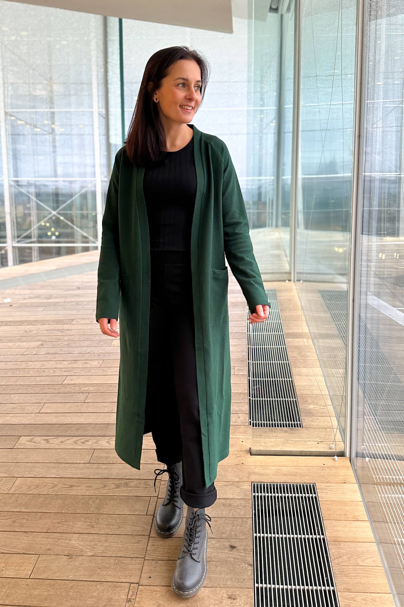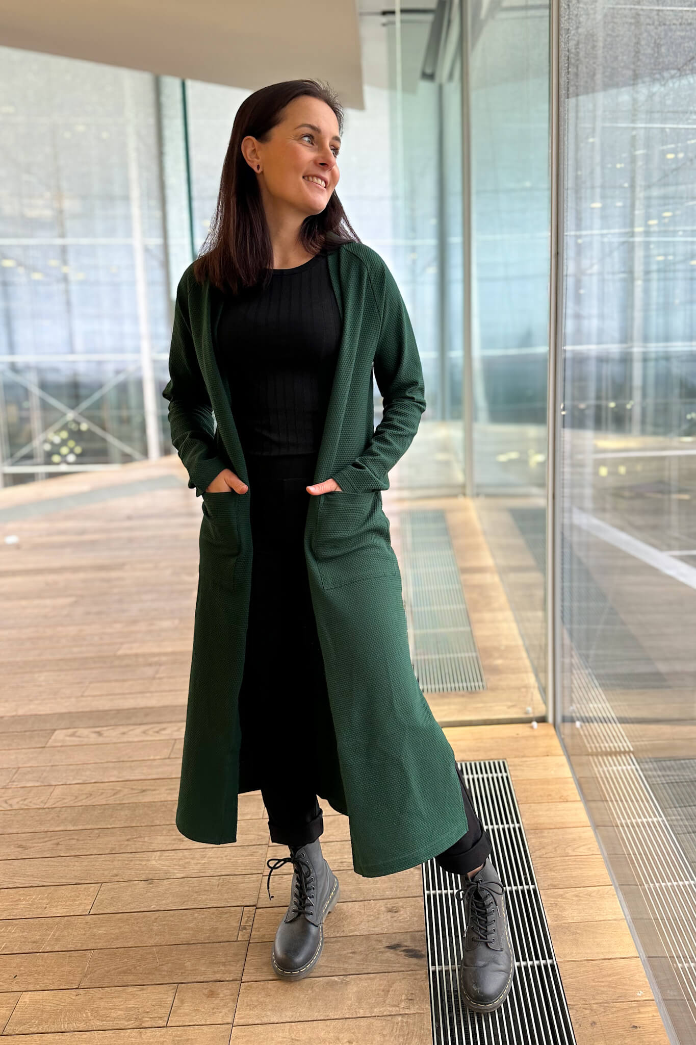 Luotto-puuvillatakki on rennon tyylikäs, mukava ja helppo lisätä mukaan asuun kuin asuun. Käytä takkia neuletakin tapaan, se toimii niin housujen kuin hameiden ja mekkojen kanssa. Halkiot sivuissa ja reilunkokoiset käytännölliset päällitaskut ovat kiva yksityiskohta. Materiaalina on 100% puuvillainen ohuehko kohoneulos, materiaalin tekstuuri tuo takkiin ilmettä! Värinä on helposti yhdisteltävä havunvihreä. Mittataulukot löydät tuotekuvista.