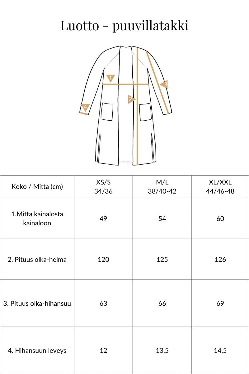 Luotto-takissa on raglanhiha, eli olkasauman istuvuus ei määritä sopivaa kokoa. Valitse koko sen mukaan kuinka väljää istuvuutta toivot ja haluatko että takki yltää edestä kiinni, merkitsevin mitta on rinnanympärys. Tuplakoko on lähempänä tuplakoon isompaa kokoa. Kangas kutistuu ensipesussa max. 5%.