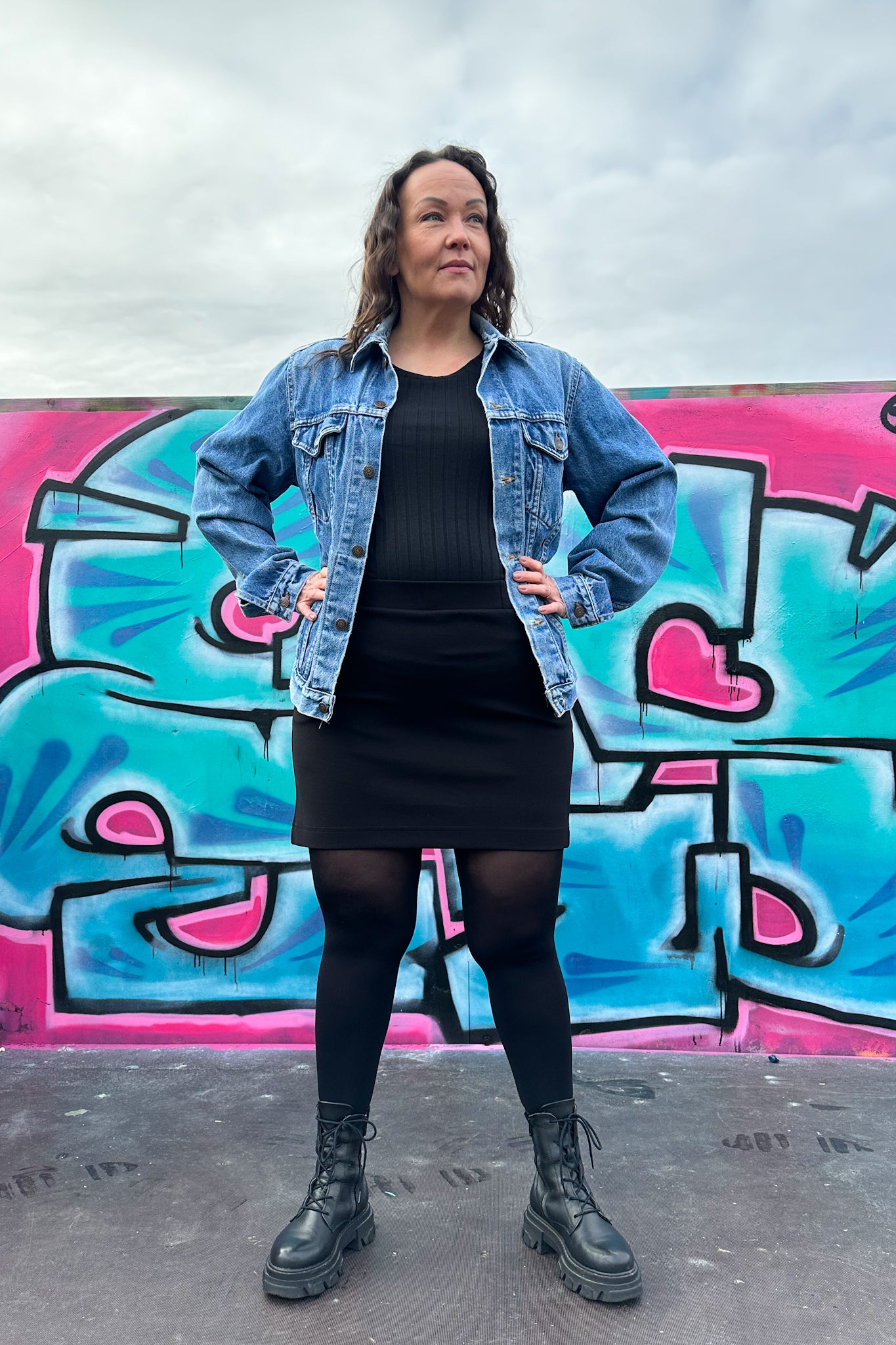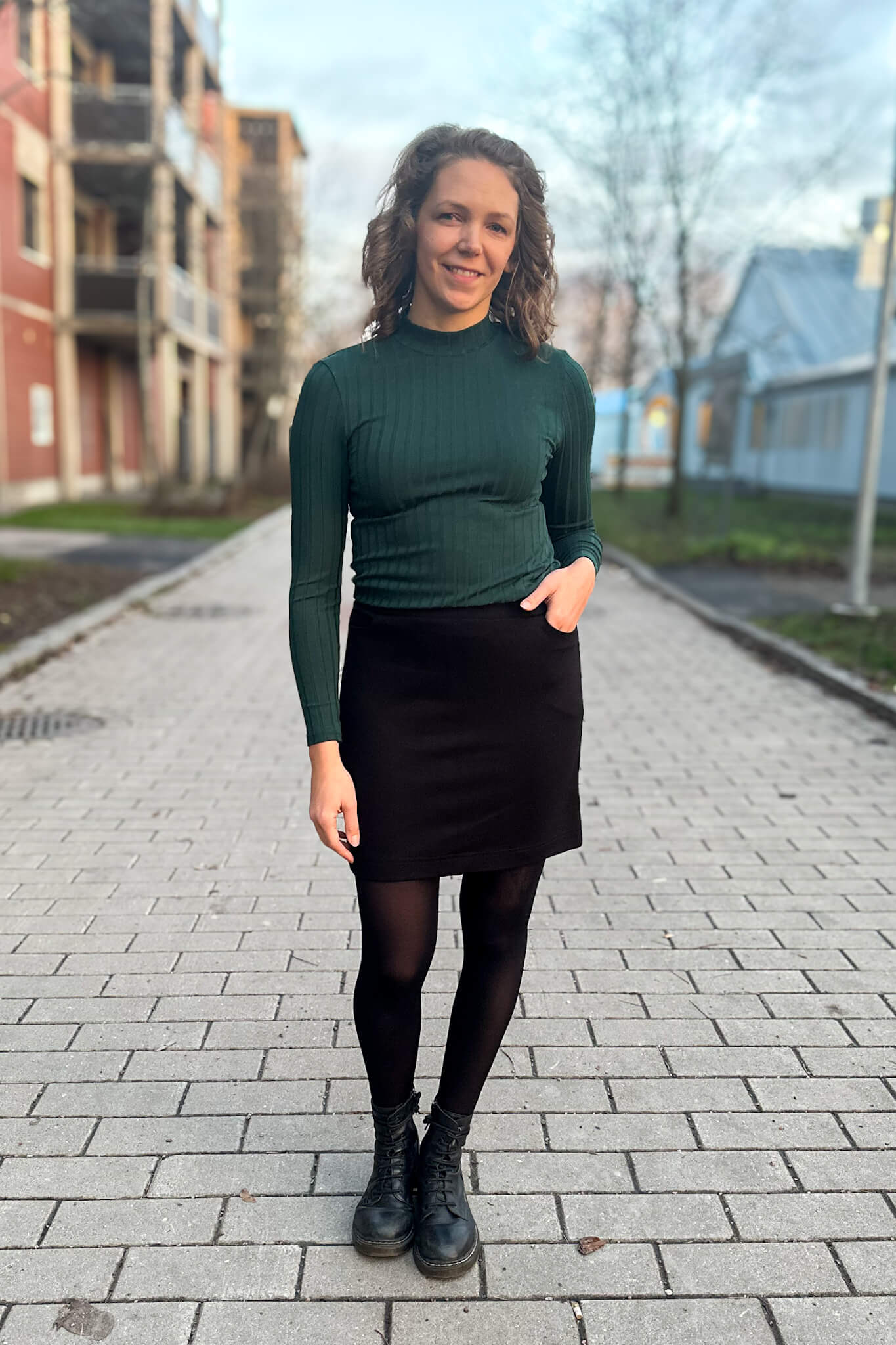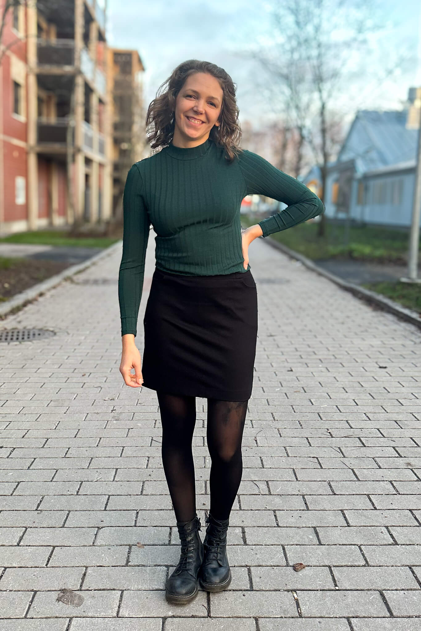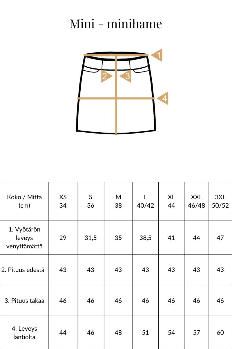 Mini on täydellisen mukava ja naisellinen minihame arkeen ja juhlaan. Minissä on korkeahko joustava kuminauhavyötärö, joka on mukava vatsalle. Hameessa on pystytaskut edessä, jotka eivät aukea käytössä. Hame on minimittainen, mutta kuitenkin sen pituinen että voit esimerkiksi mukavasti istua. Minihame sopii monenlaiseen tyyliin, yhdistä minihame esimerkiksi pitkähihaiseen Kiva-ribbipaitaan tai väljään oversize yläosaan, mustiin sukkahousuihin ja saappaisiin tai maihareihin. Materiaalina on paksuhko ja joustava viskoosipuntoneulos. Mittataulukot löydät tuotekuvista.