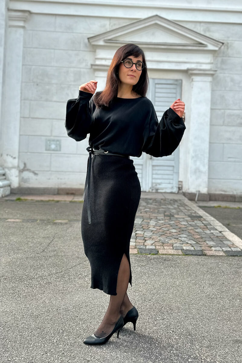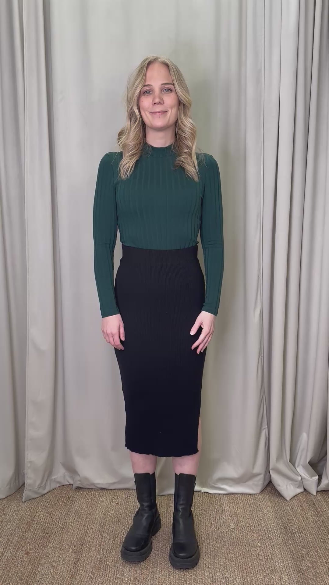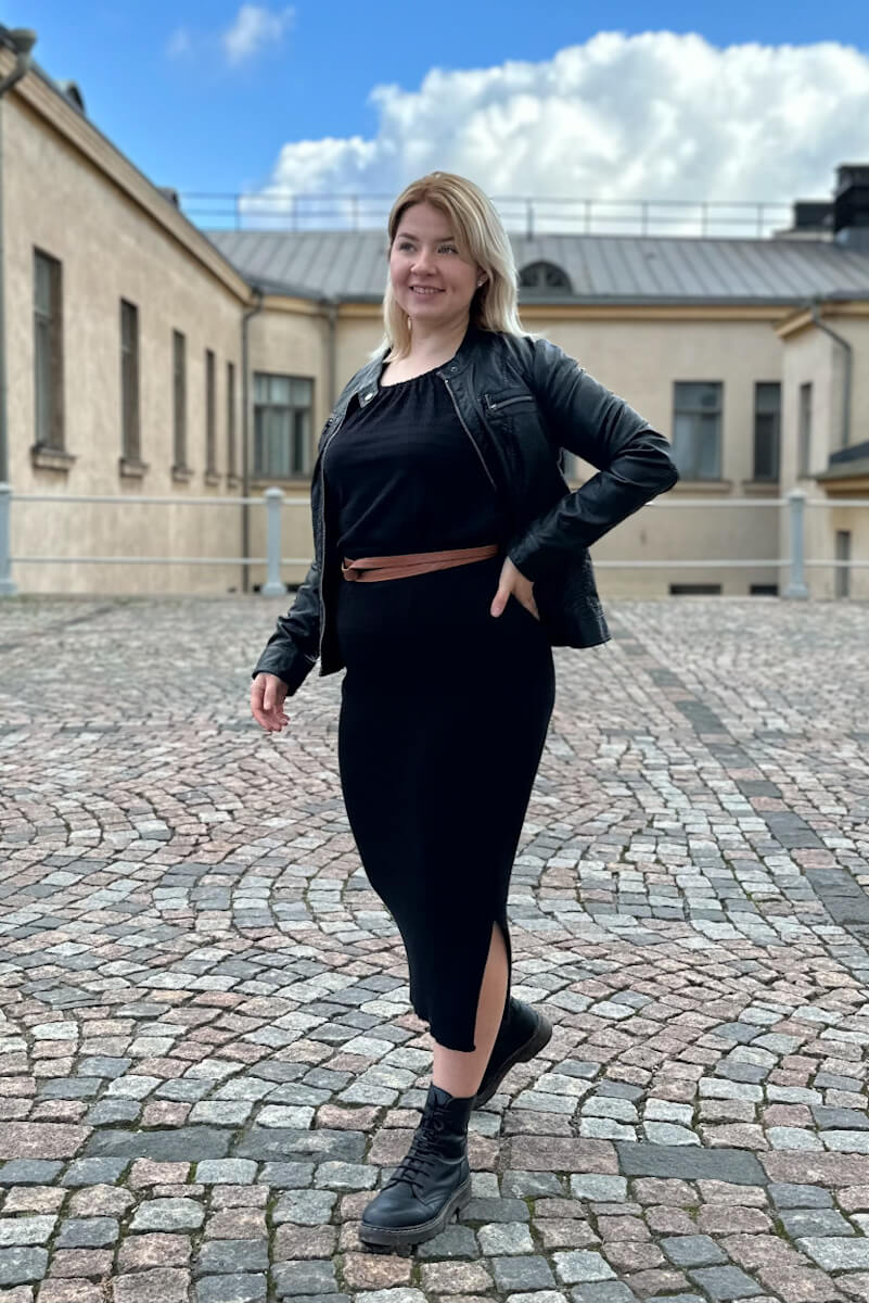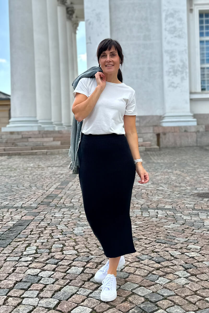 Poistuva tuote! Tyyni -neulehame on valmistettu joustavasta ja ihanan pehmeästä 100% luomupuuvillaisesta ribbineuloksesta. Midipituisessa hameessa on korkea kuminauhavyötärö, halkio sivussa ja hameen pituus ulottuu noin säären puoliväliin. Pituutta voit muokata asettamalla hameen vyötärön ylemmäs tai alemmas. Joustavassa neulehameessa on helppo liikkua, kuminauhavyötärö on mukava vatsalle ja yksinkertaisen tyylikäs malli antaa sinulle vapaat kädet luoda Tyyni-hameen ympärille juuri sinulle sopiva tyyli! Hame on valmistettu zero waste -menetelmällä Kainon neulomossa Suomessa. Luethan hameen huolto-ohjeen, joka kertoo neuloksen ominaisuuksista. Mittataulukot löydät tuotekuvista.