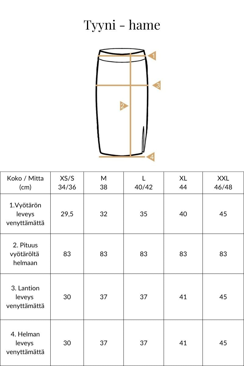 Tyyni-hameen neulos on erittäin joustavaa, joten valitse sopiva koko vyötärönympäryksen perusteella. Hameesta löytyy koot XS/S, M, L, XL ja XXL. Hameen pituus on midi ja halkion korkeus 23cm.