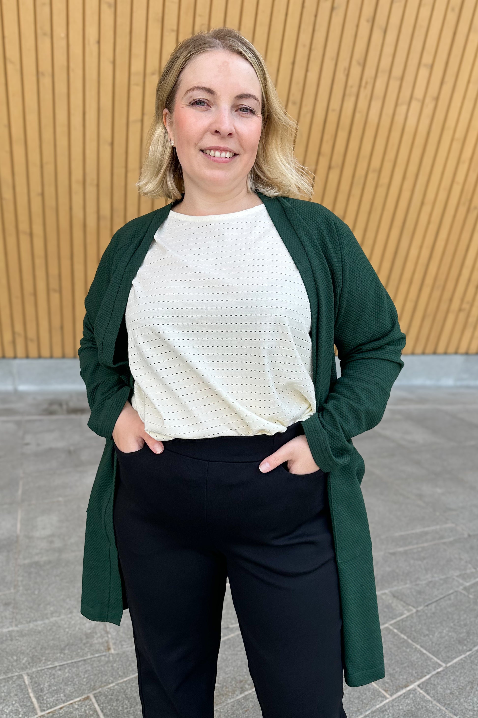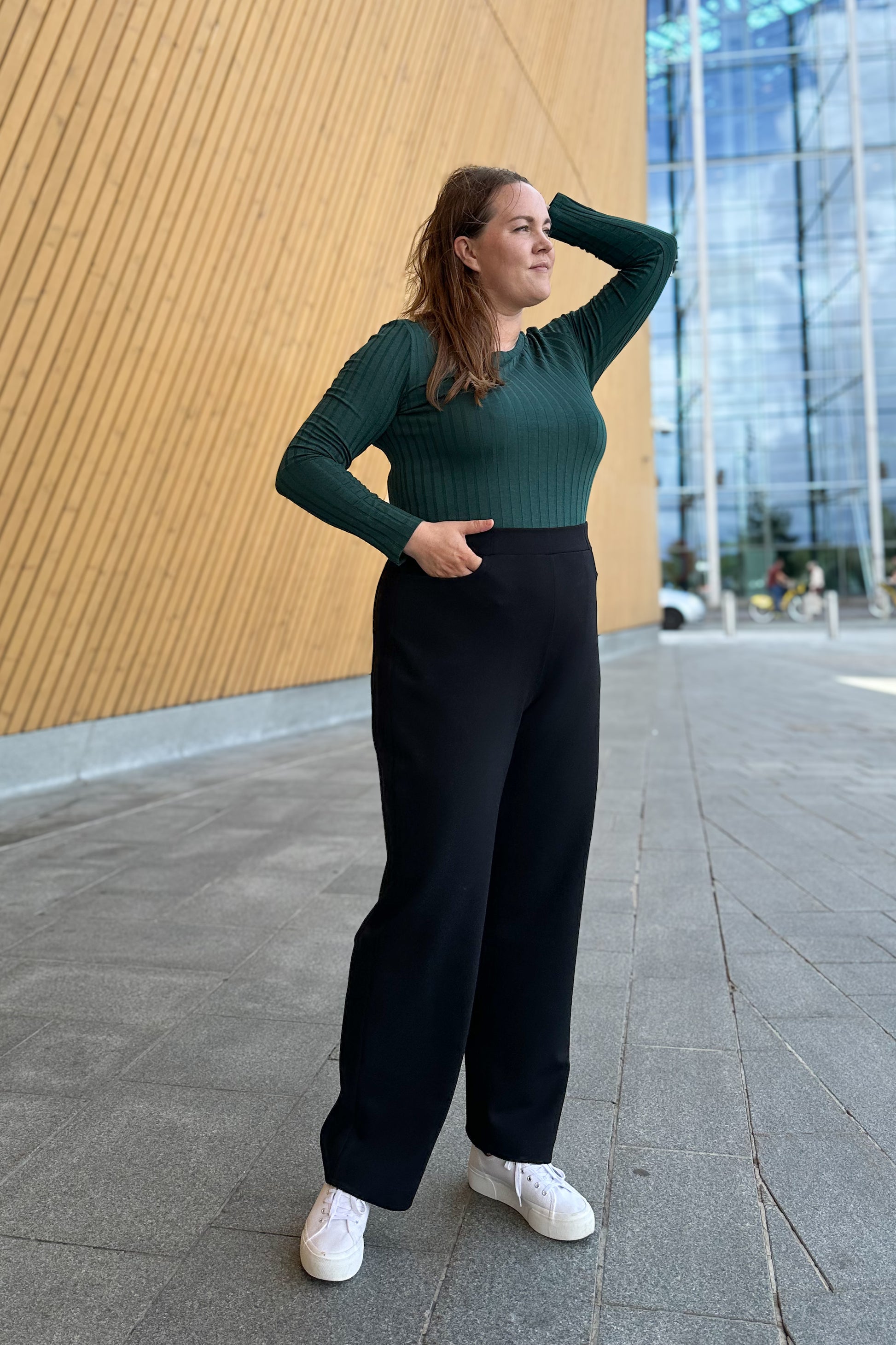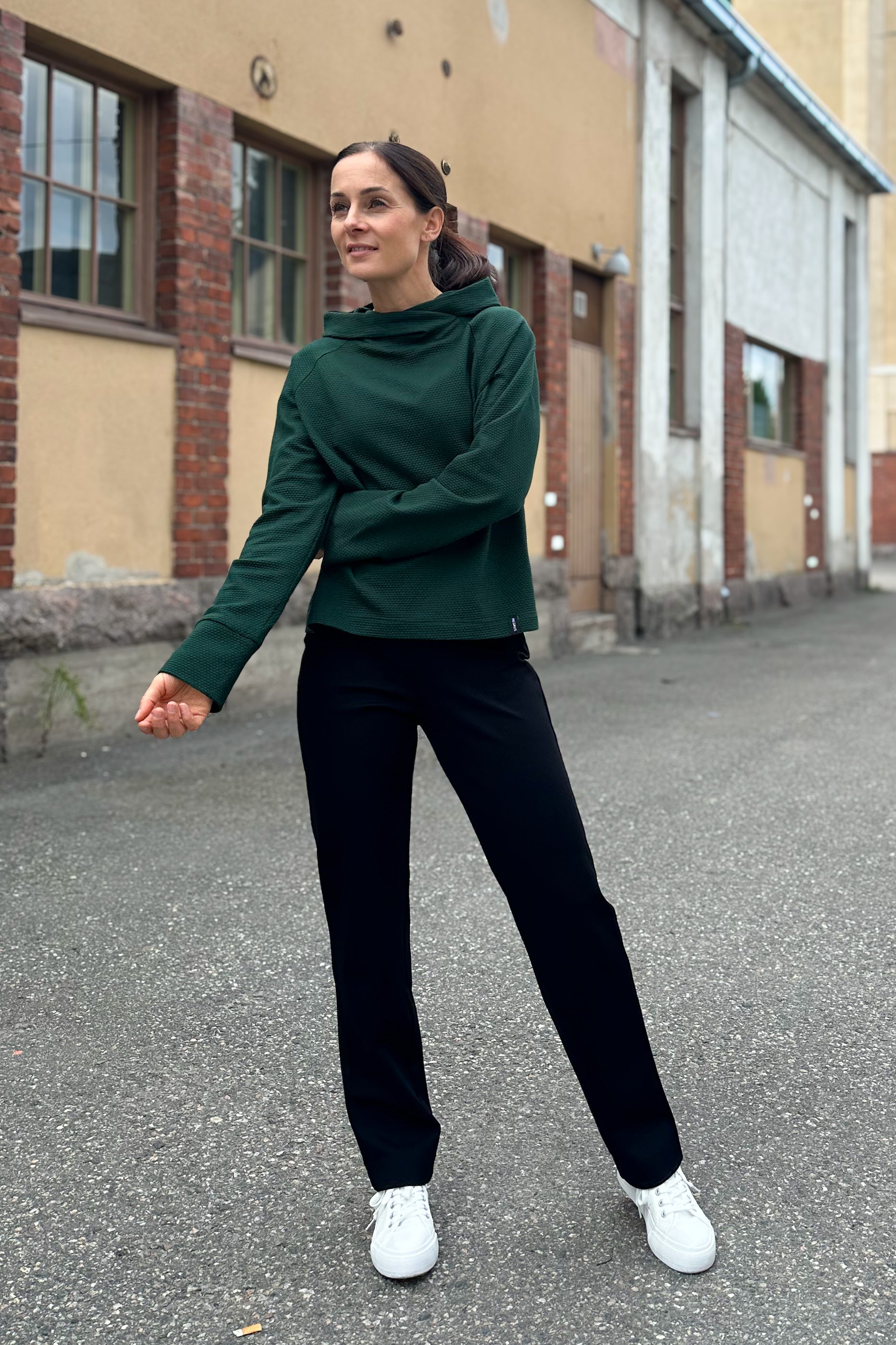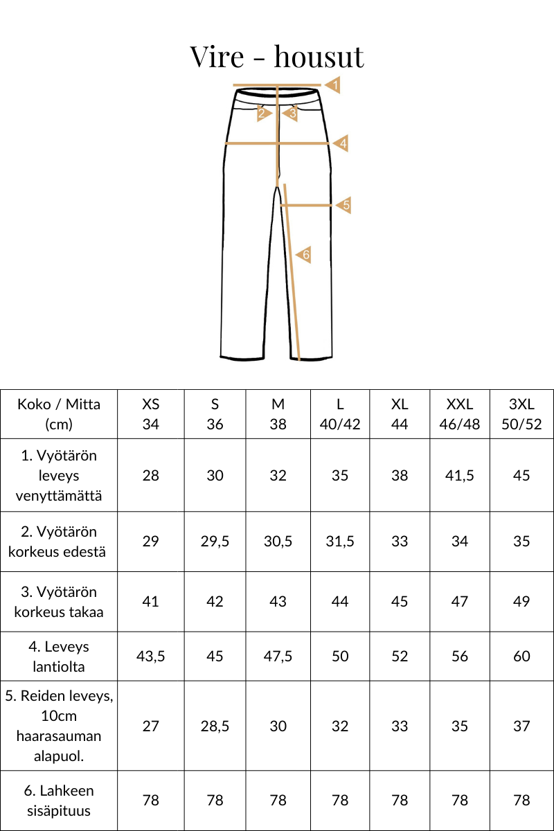 Vire-housut ovat mukavat ja monenlaiseen tyyliin sopivat housut töihin ja vapaa-ajalle. Vire-housuissa on korkea joustava kuminauhavyötärö, joka on mukava vatsalle. Housuissa on pystytaskut edessä, joten ne eivät aukea käytössä lanteikkaallakaan. Vire-housuissa on suora täyspitkä lahje. Materiaalina on mukava ja napakka viskoosipuntoneulos. Mittataulukot löydät tuotekuvista.